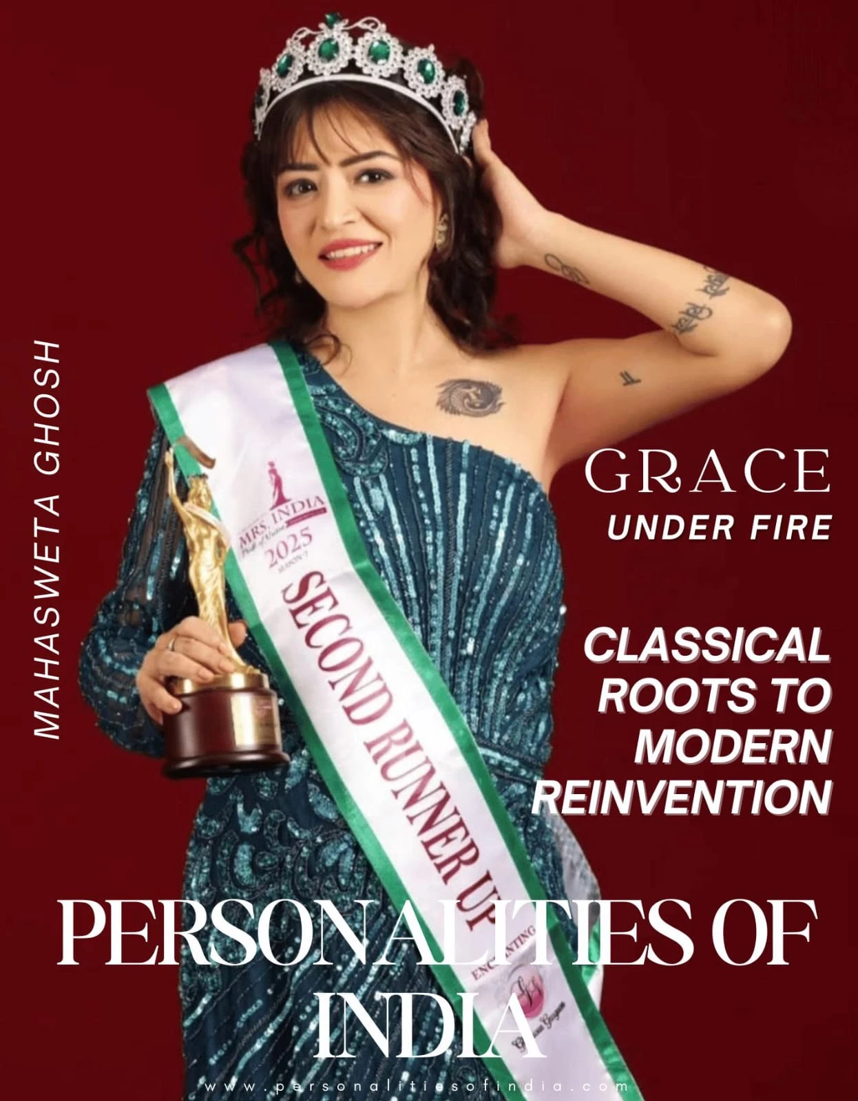 Along this extraordinary journey, milestones quietly accumulated, each one unfolding at its own time and shaping her artistic identity. At the age of six, her Guru Padmavibhushan Girija Devi introduced her first vocal recital—a Khayal in Raag Yaman—at the Sangeet Research Academy, performed before veteran cultural maestros on the occasion of the 60th birthday of the legendary violinist Pandit V. G. Jog. By thirteen, her voice had travelled far beyond borders as she performed Indian classical vocal recitals across several cities in Europe, earning recognition and coverage in international newspapers. Parallel to her musical journey, she became a familiar and much-loved face on television from a tender age, anchoring popular shows, acting in feature films and television serials, appearing in over fifty-five advertisements, and featuring in multiple music videos. Deeply rooted in dance, she underwent rigorous training in Odissi under the guidance of her mother and Guru, Bidushi Monalisa Ghosh, and later had the honour of performing at the Mahakumbh, an event organized under the Ministry of Women Empowerment and Social Justice. In December 2025, her multifaceted journey was further acknowledged when she was crowned Mrs India – Pride of Nation Runner-Up and awarded Mrs Beautiful Smile in Colombo. Yet, for her, these accolades have never been the destination—only gentle milestones along a path driven by purpose, resilience, and inner calling.